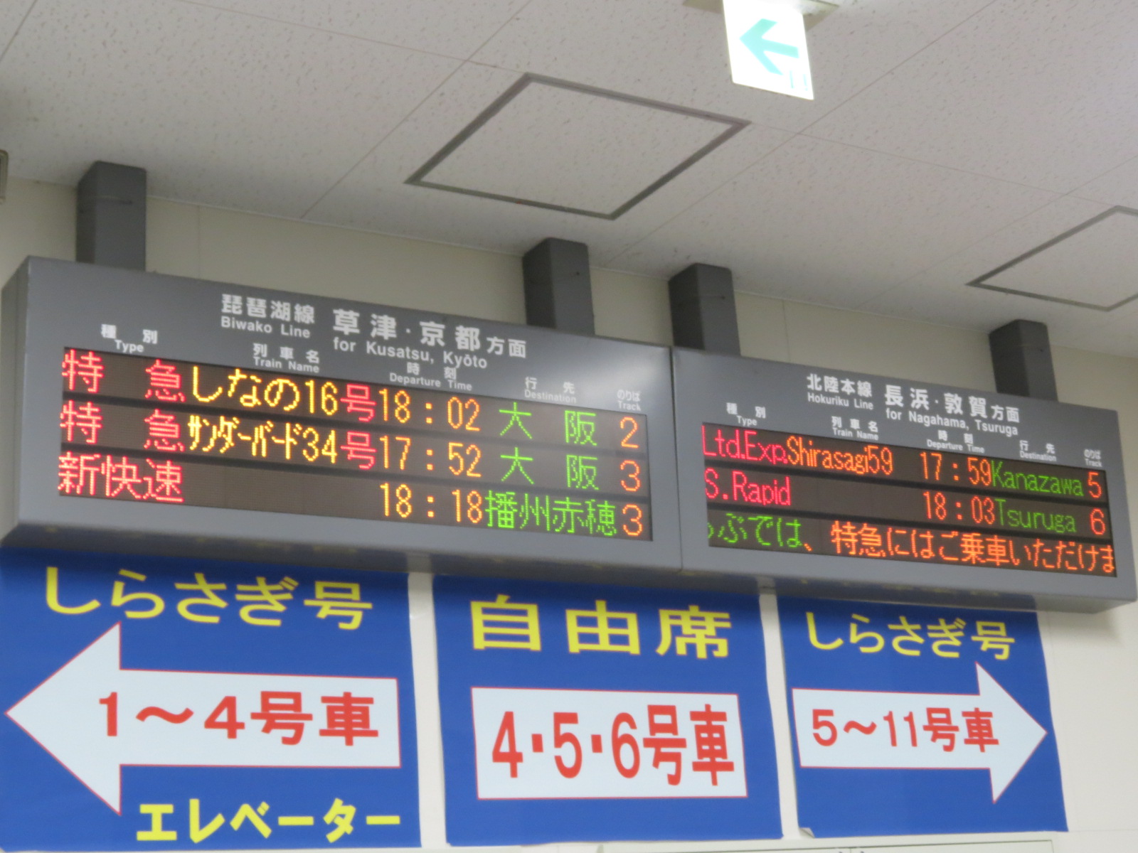 今日は湖西線が強風の影響で、サンダーバードが米原経由に変更されたため、電光掲示板が異様な光景になっています(笑)